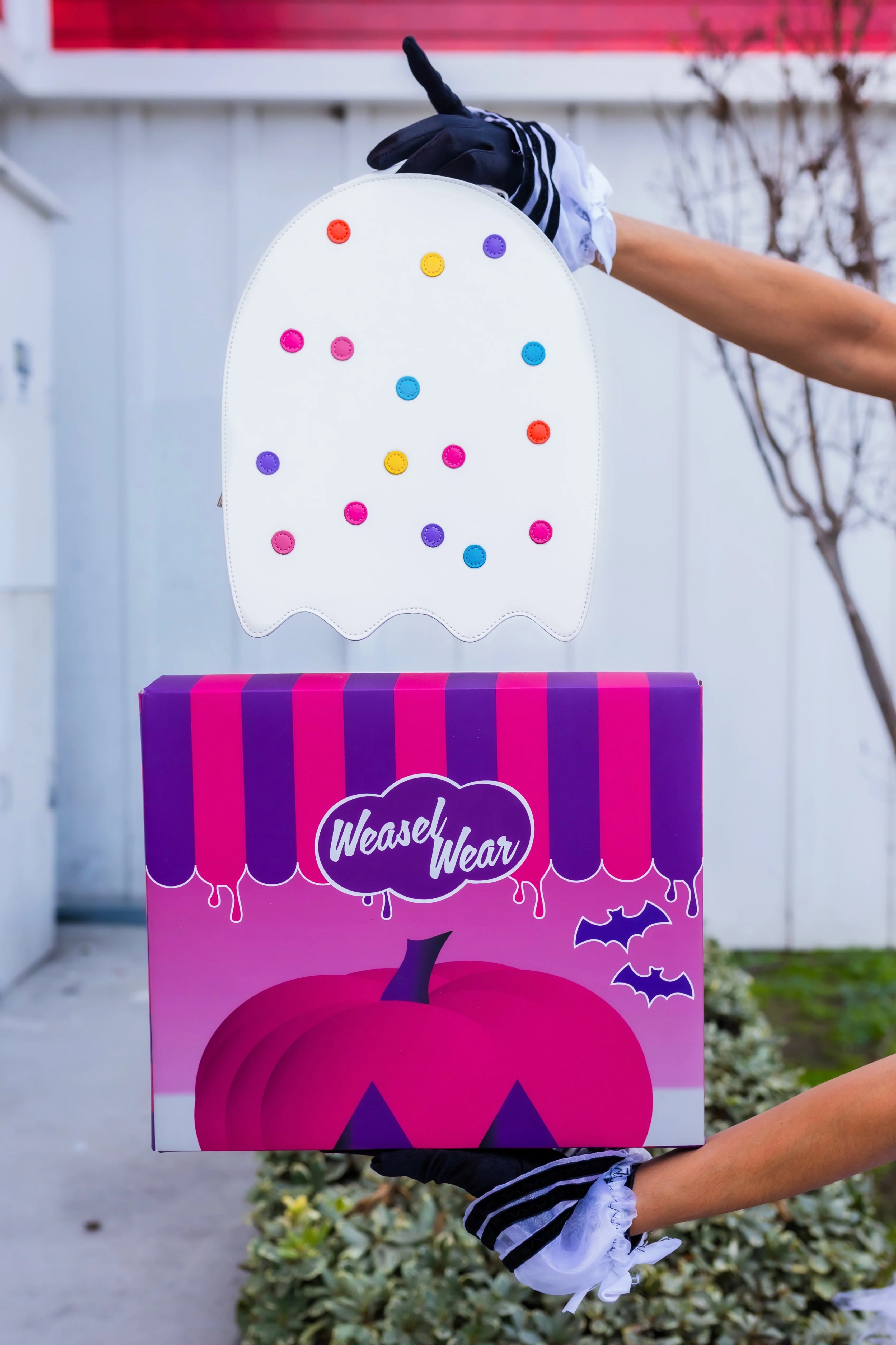 Crafted from premium white vegan leather, this hauntingly cute handbag is dotted with rainbow sprinkles that capture the joy of the classic treat. The interior lining features bold pink-and-purple stripes, a playful nod to retro cookie packaging, while thoughtful interior details, including a zipper pocket and dual card-holder slots, make it as functional as it is adorable.
