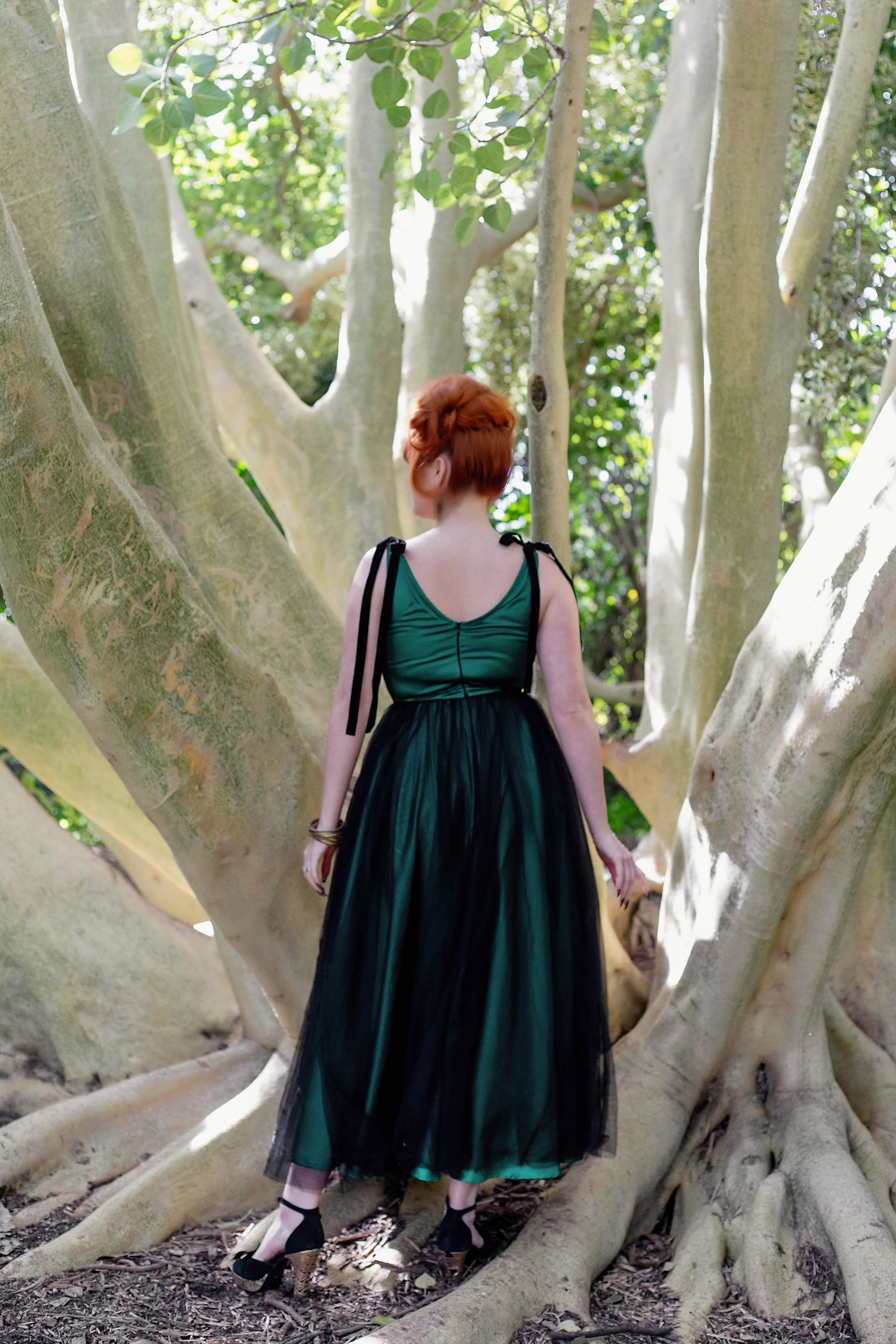 Forest Green Embellished Ribbon Gown - Black Organza A-Line Gown with Emerald Satin Lining & Velvet Ribbon Straps (Enchanted Woods Edition)