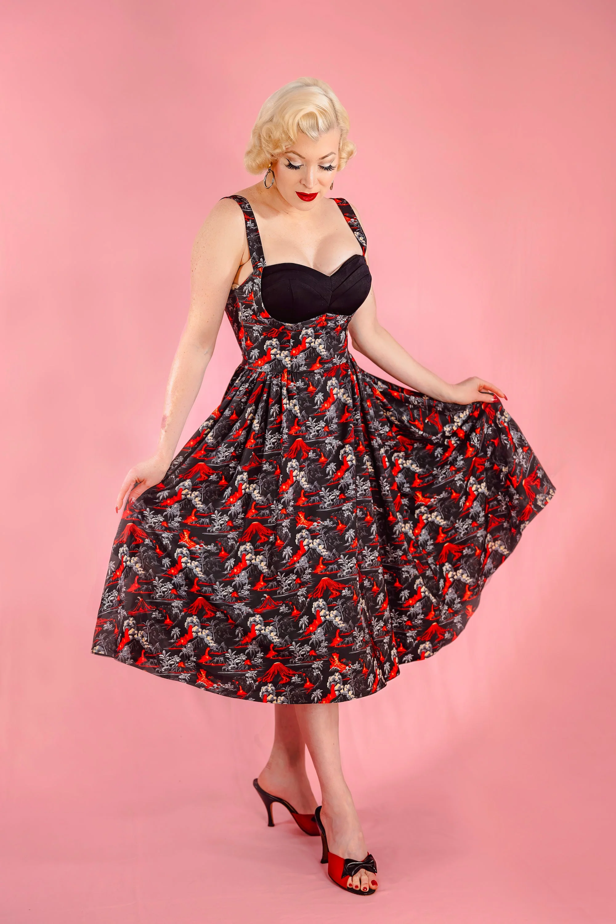 Get ready to unleash your fire inner with this 1950s-inspired stunner! Love in Portofino features a flirty shelf bust that flatters like a dream, with built in bust padding for structure and adjustable straps for that just-right fit, and side seam pockets (yes, pockets!), this dress is as bold as its fiery volcanic-inspired print. The full, twirl-worthy skirt adds a playful flair, making it perfect for everything from tiki nights to daytime adventures. Slip into this beauty and let the good times (and lava) flow🌋