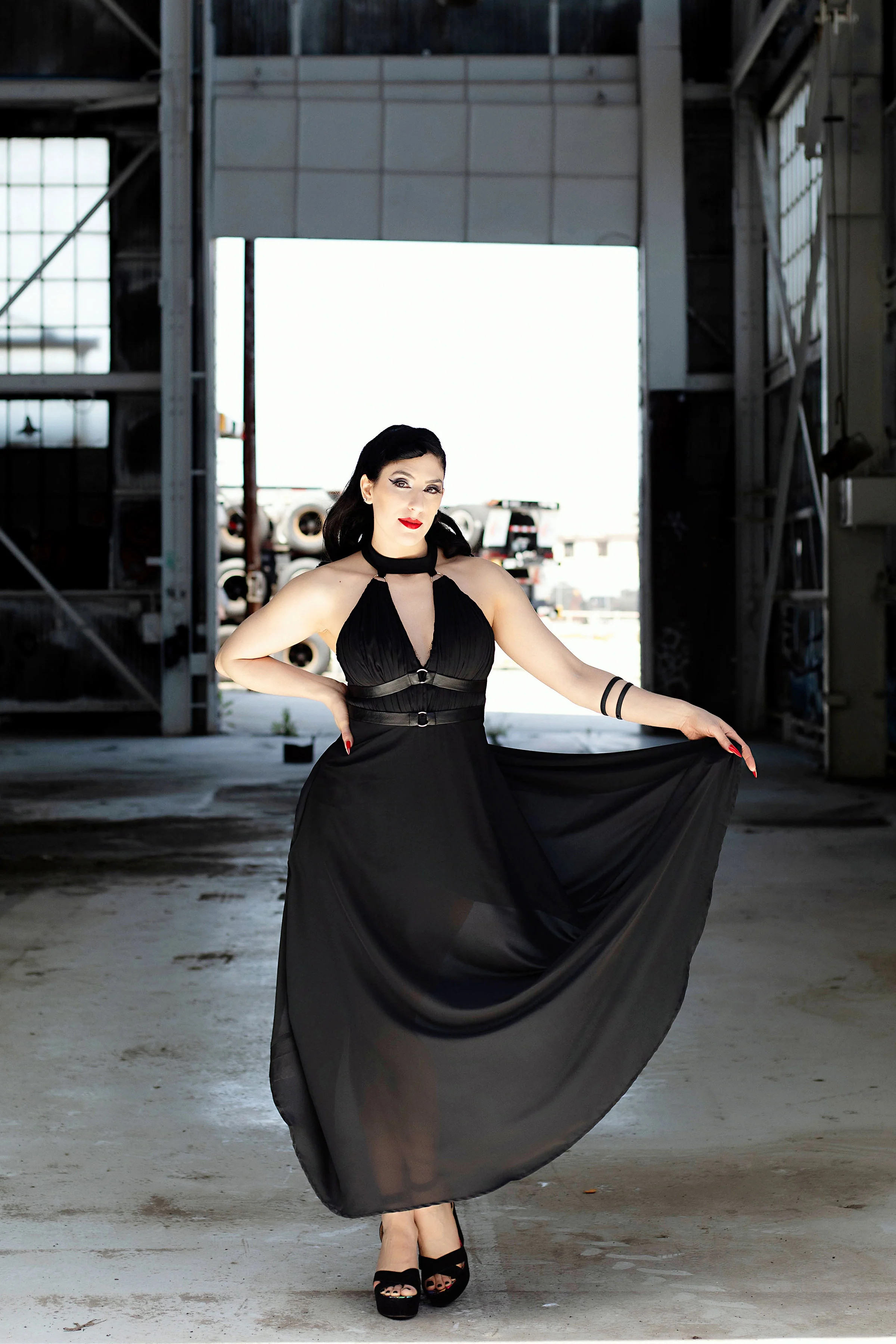 Meggy Ruched Harness GownMeggy Ruched Harness Gown - Black Chiffon Racer-Neck Gown with Built-In Harness & Choker (Witchwave Edition)