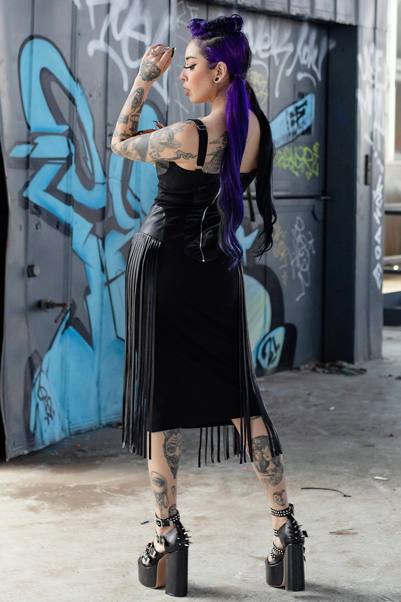 Miranda Mae Faux-Leather Fringe Dress - Bustier Ponte Dress with Fringe Hips & Silver Zipper (Non-Conformist Edition)