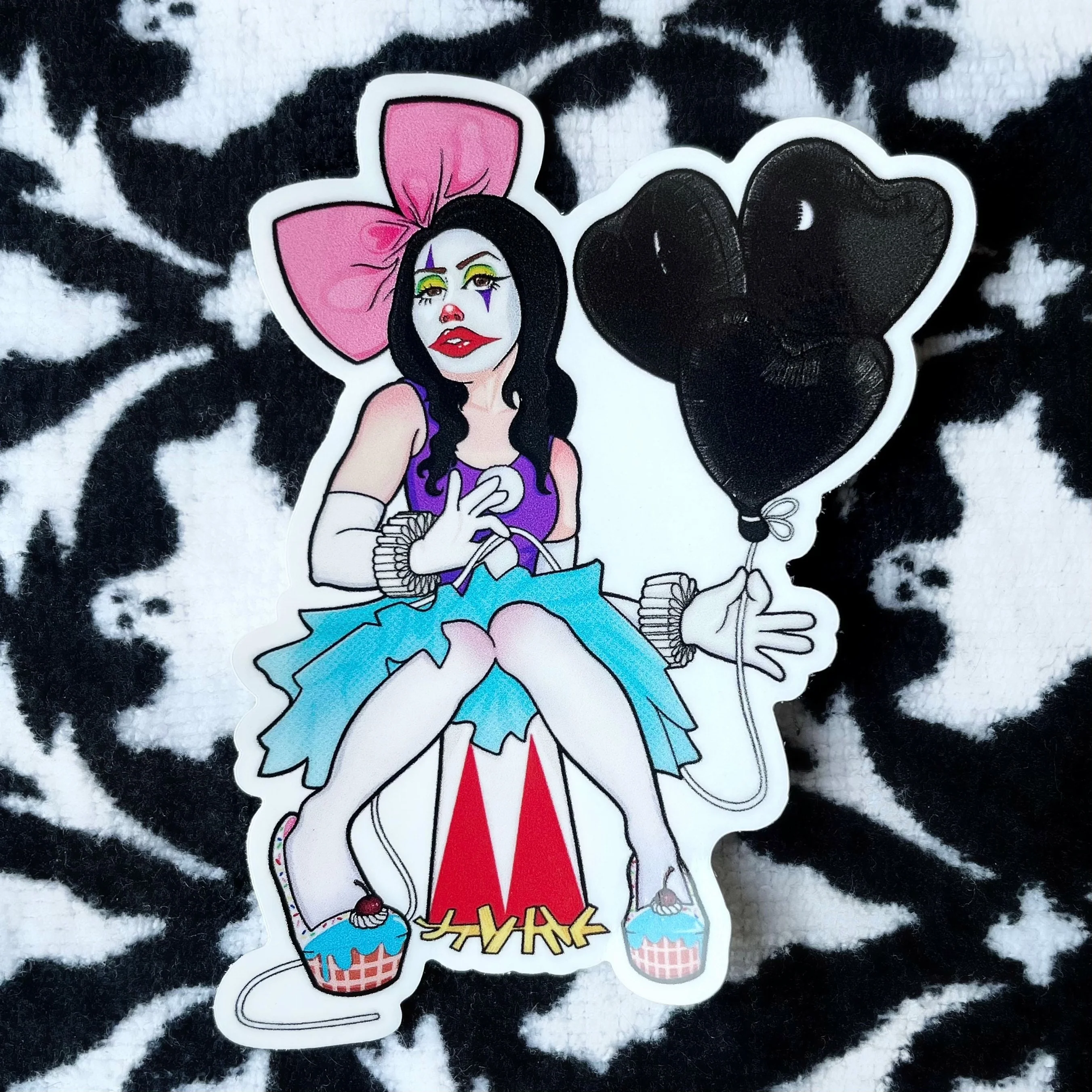 Modeled after our founder Miss VonFrankenstein’s cosplay look, this sultry circus freak is sure to brighten your day!! Approximately 4” in size, our confectionery clown sticker is perfect for adorning laptops, notebooks, skateboards, phone cases, tablets, water bottles, etc. Beautiful Bella possesses a glossy finish, and is water-resistant for maximum longevity