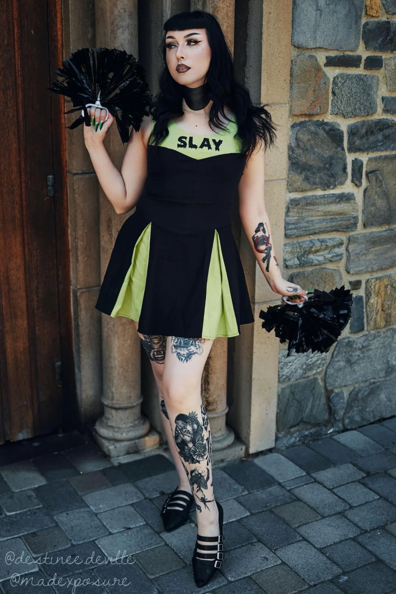 The bold “Slay” lettering across the chest serves as a monstrous reminder to stay fierce, while the pleated, cheer-style skirt adds playful contrast, preppy meets paranormal. Available in minty slime green or blood spatter red, it’s a look that slays from campus to crypt.